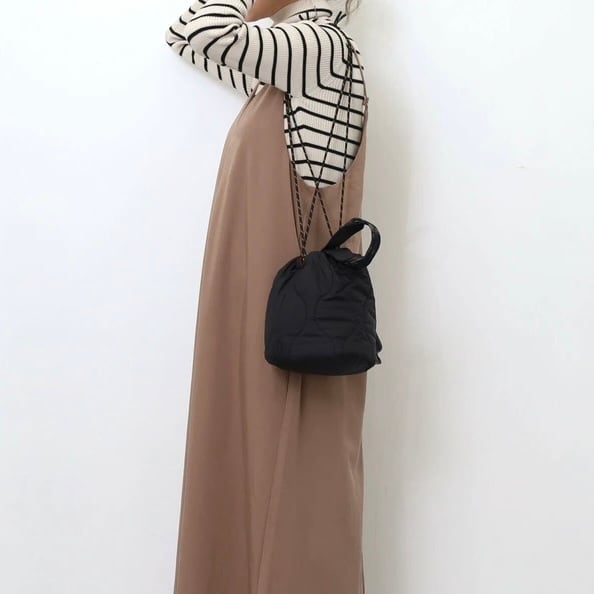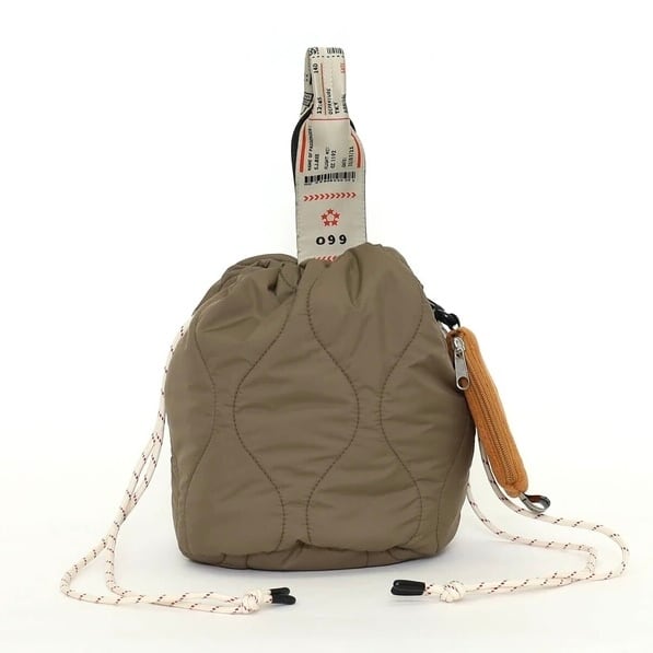 キルティングとフリース風素材のコンビがポイントの巾着型ワンショルダーバッグ。