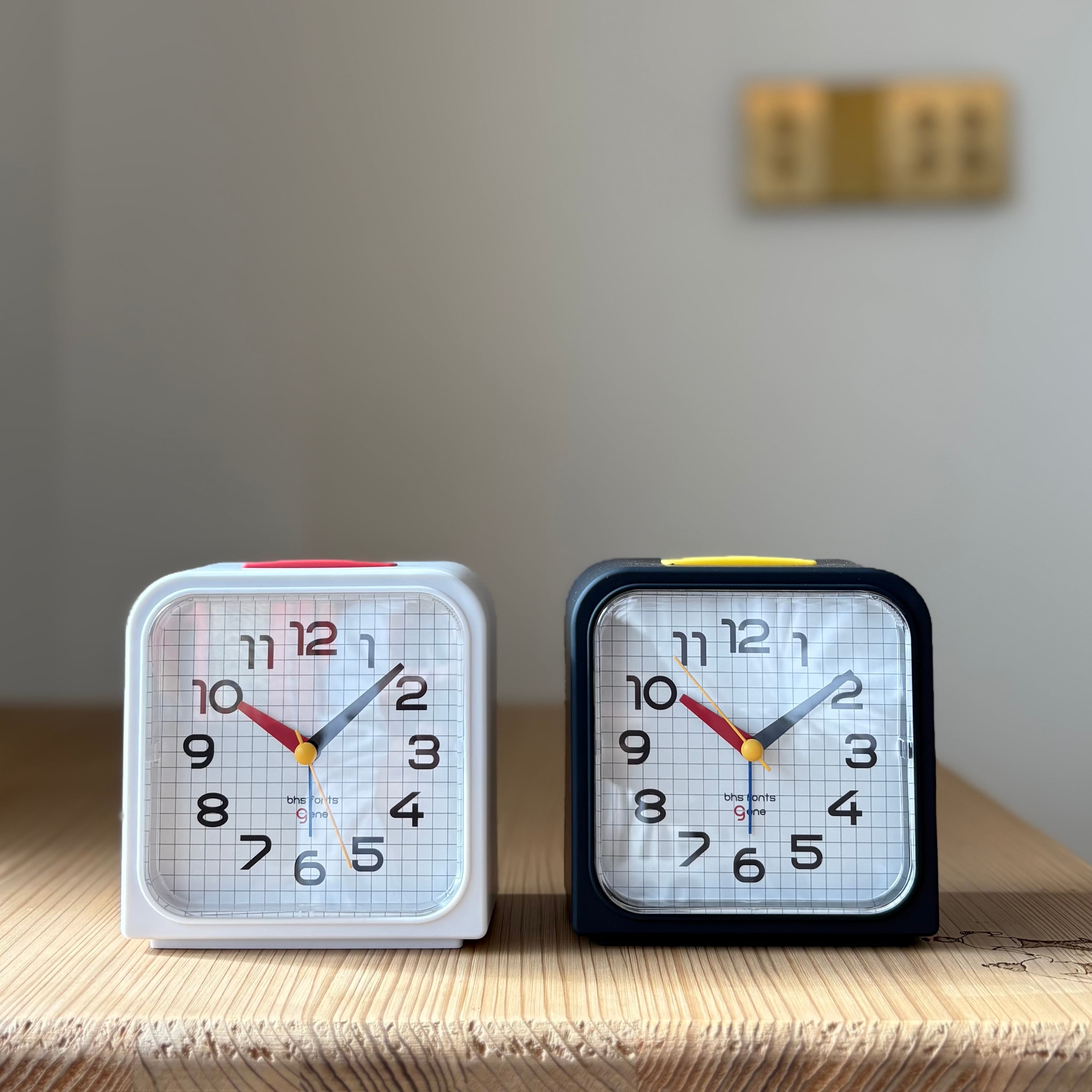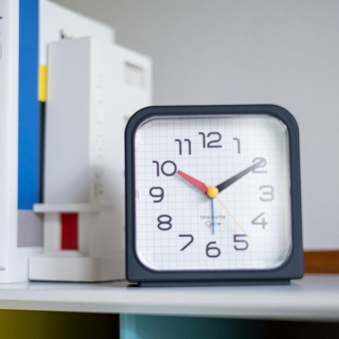 バウハウスを代表するフォントアーティスト、ヘルベルト バイヤー(Herbert Bayer) に由来するフォントと、グリッドパターンを組み合わせた置き時計。
