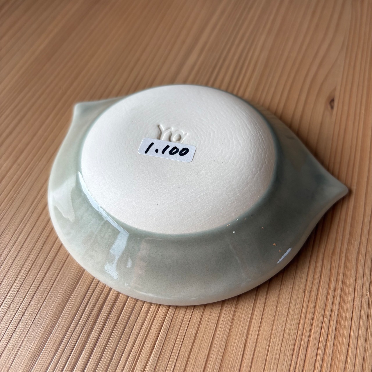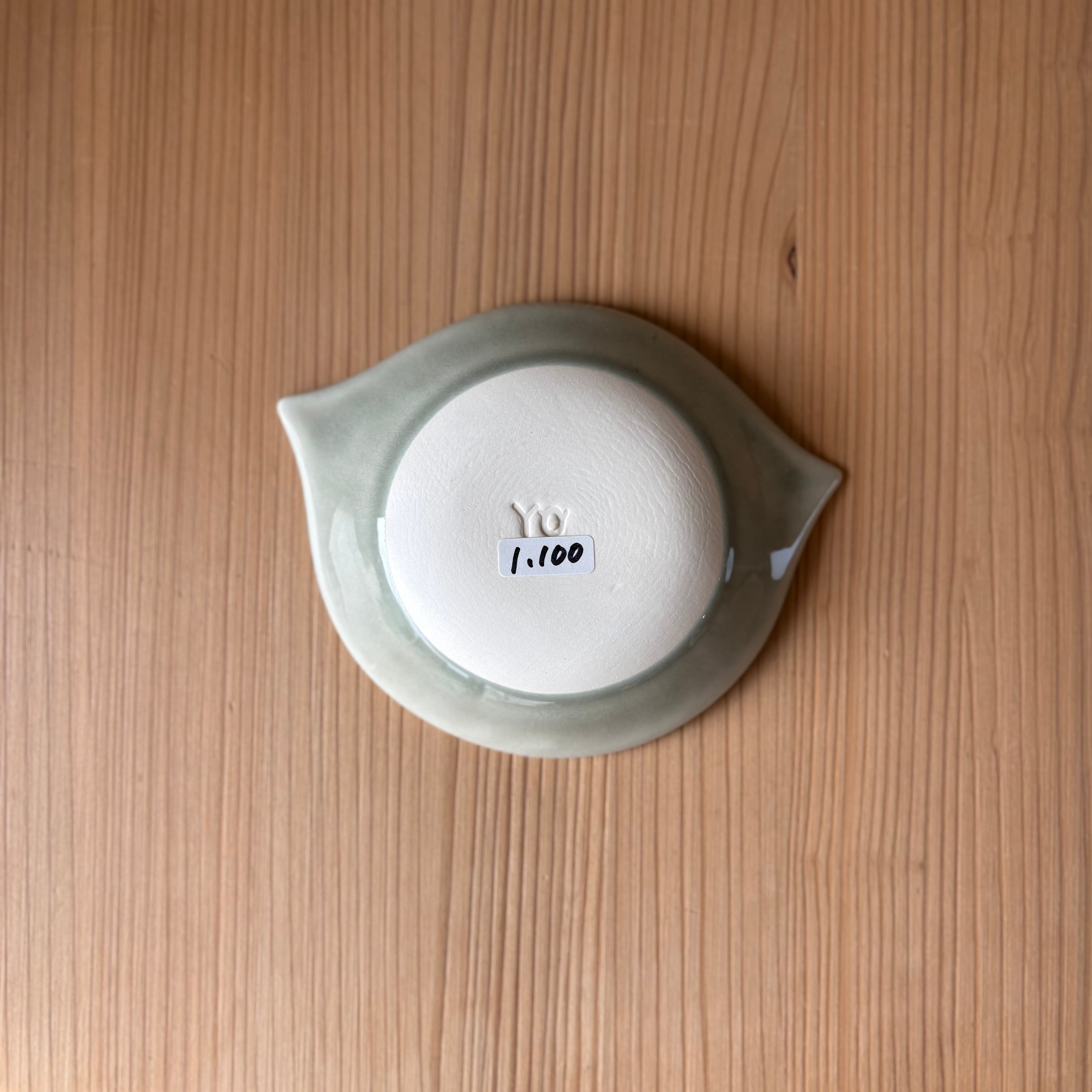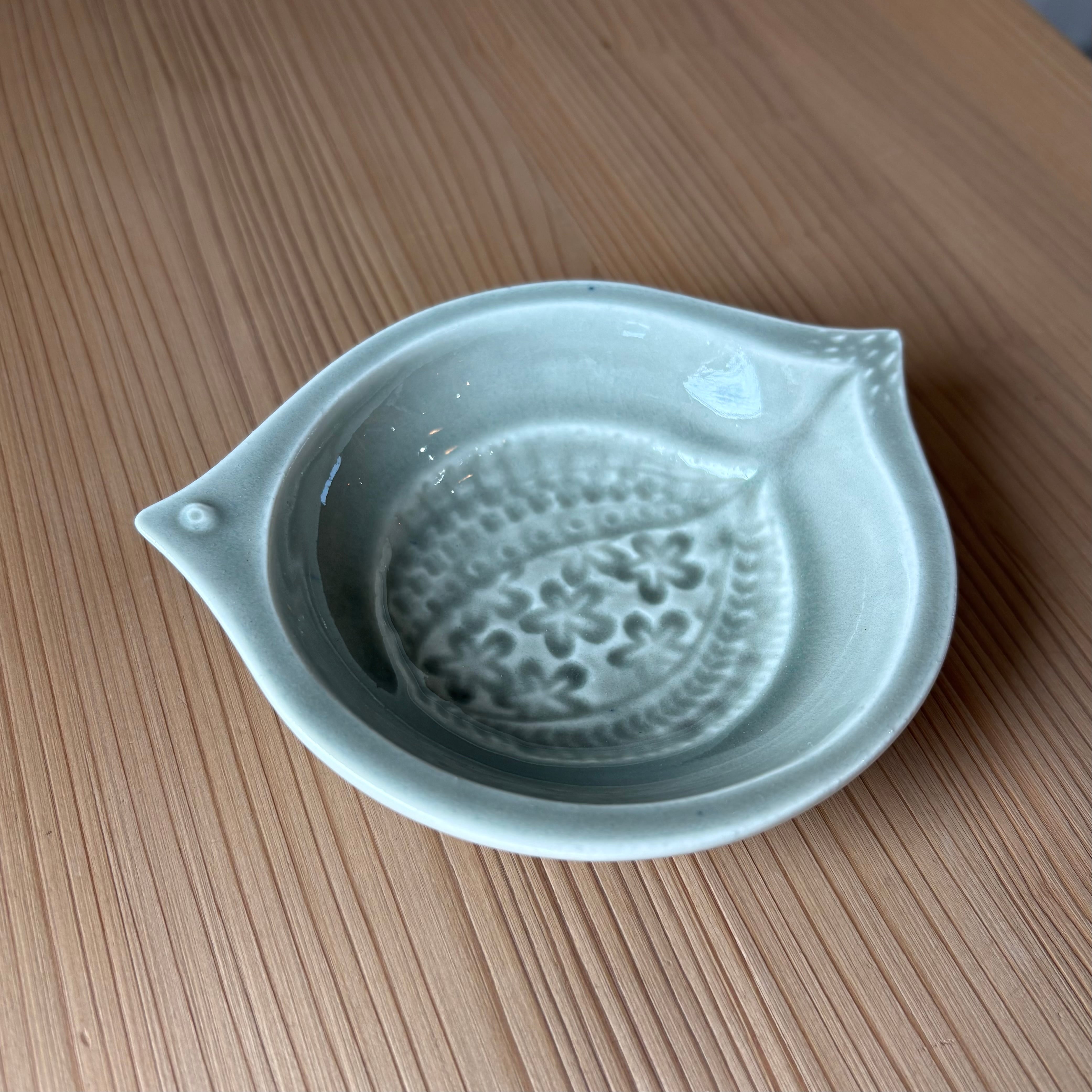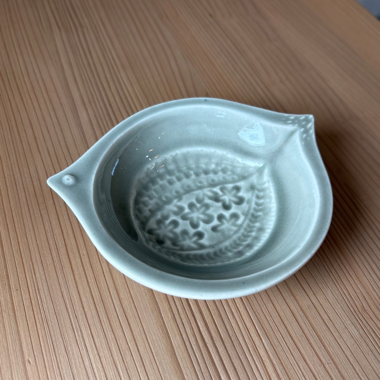 ややグレーがかった緑色の落ち着いた色合いです。かわいらしい印象の小鳥皿にフォレストグリーンの釉薬を合わせることで、ちょっぴりシックで大人な雰囲気に。